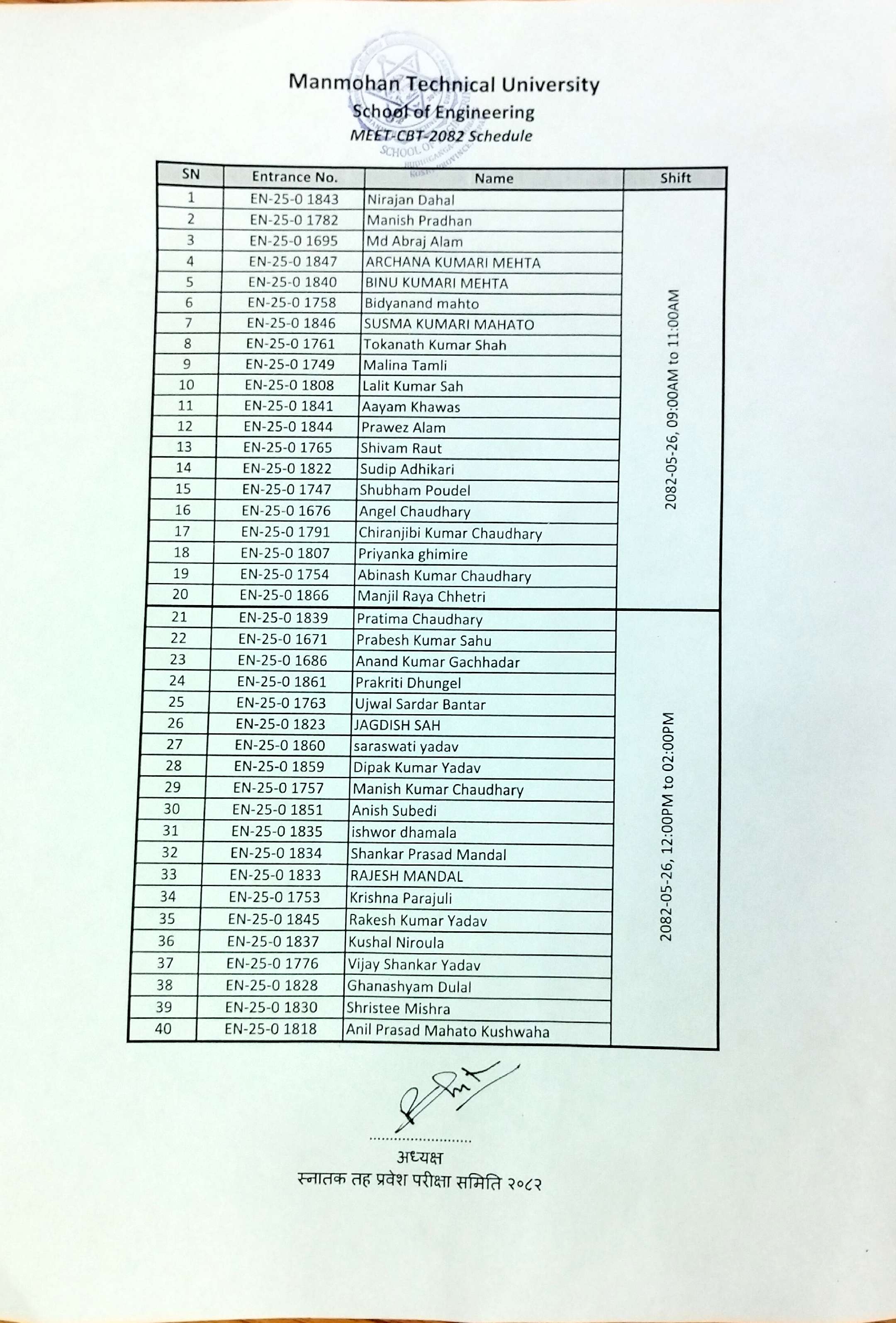 2082-05-20 (05-09-2025) स्नातक (वि.ई.) तहको प्रवेश परीक्षाको विस्तृत तालिका सम्बन्धी सूचना ।