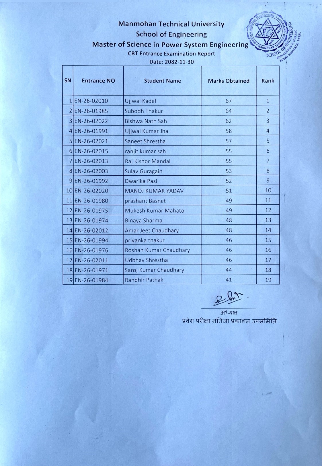 2082-11-30 (14-03-2026) स्नातकोत्तर तह पावर सिष्टम इन्जिनियरिङको प्रवेश परीक्षामा उर्त्तिण परीक्षार्थीहरुको योग्यताक्रम सूची प्रकाशन गरिएको सम्बन्धी सूचना ।