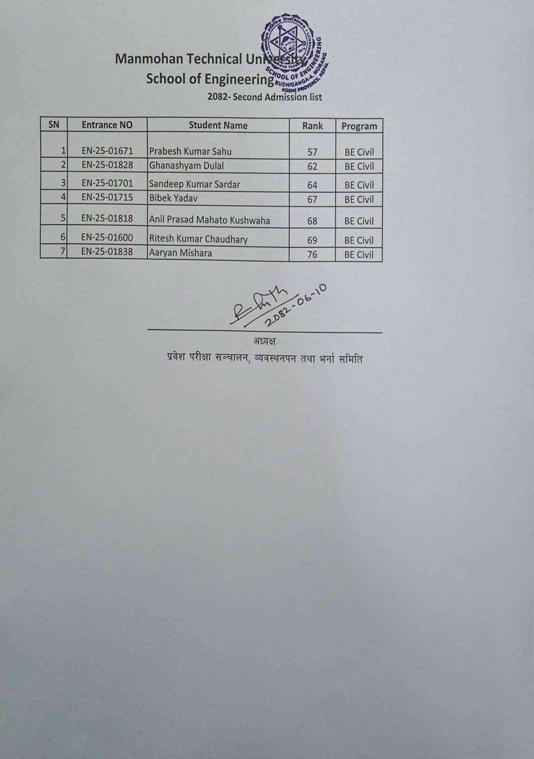 2082-06-10 (26-09-2025) स्नातक तह इन्जिनियरिङ कार्यक्रम शैक्षिक सत्र २०८२ का दोश्रो भर्ना सुची प्रकाशन सम्बन्धि सूचना ।